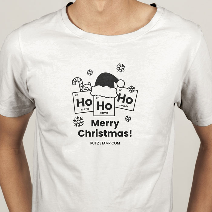 T-shirt homem Ho Ho Ho super divertida e original para prenda de Natal. T-shirt de natal para oferta com elemento Holmium da tabela periódica.